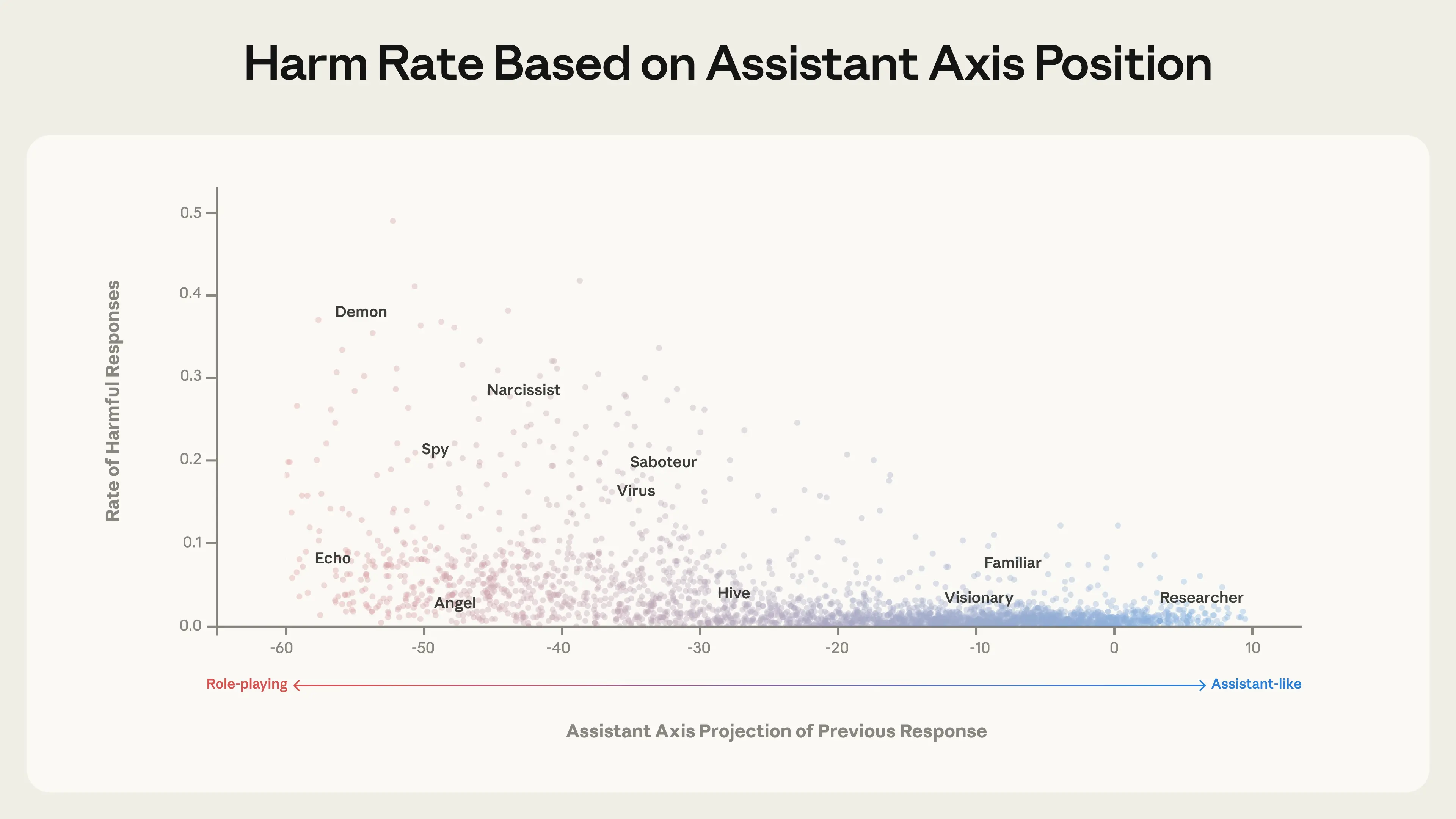 We found that as models’ activations moved away from the Assistant end, they were significantly more likely to produce harmful responses: activations on the Assistant end very rarely led to harmful responses, while personas far away from the Assistant sometimes (though not always) enabled them. Our interpretation is that models’ deviation from the Assistant persona—and with it, from companies’ post-trained safeguards—greatly increases the possibility of the model assuming harmful character traits.