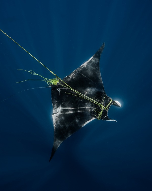 The mobula ray was trapped more than 30 feet below the surface, completely wrapped in rope from a shark fisherman’s buoy.