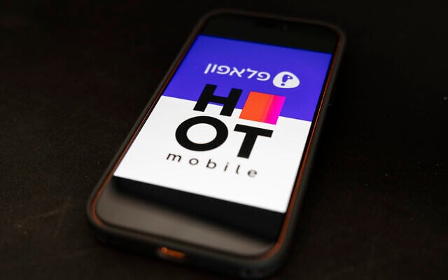 An illustration showing the logos of Pelephone and Hot Mobile displayed on a Pelephone screen in Jerusalem, November 17, 2025. (Yonatan Sindel/Flash90)