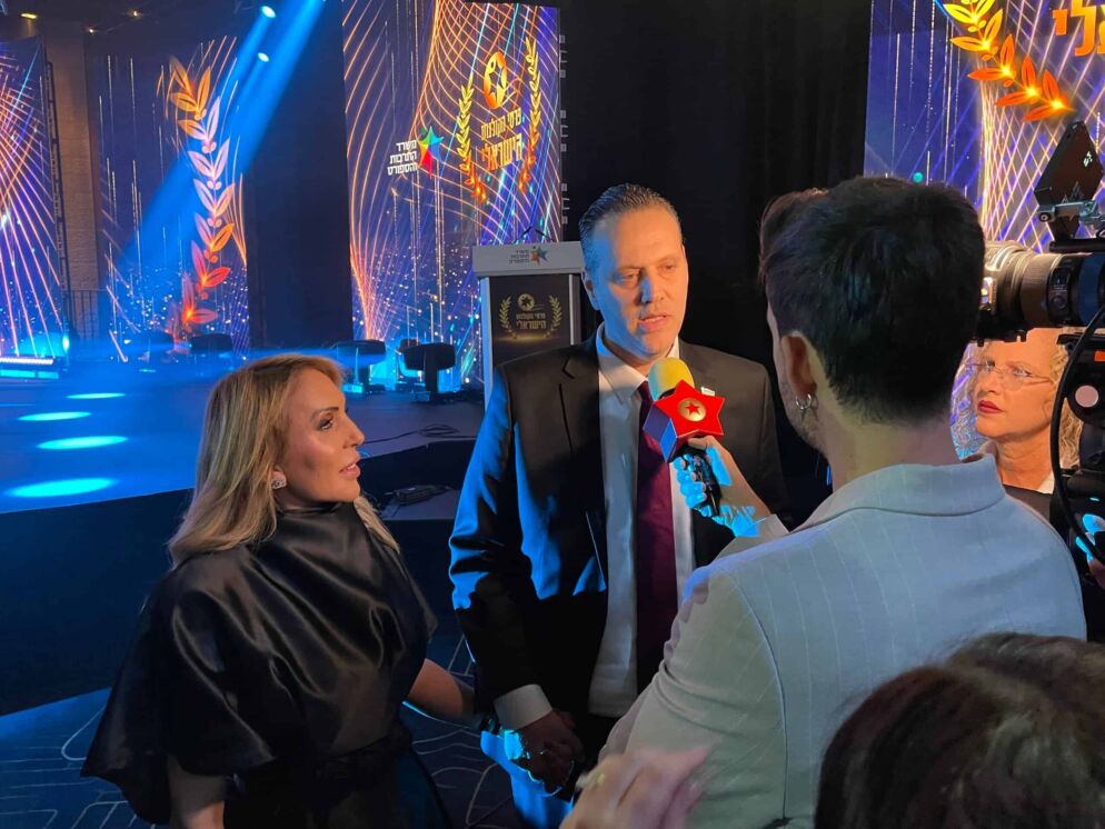 Accompanied by his wife, Israeli Minister of Culture and Sports Miki Zohar talks to the press at the Israeli Film Awards at the International Convention Center, Jerusalem, Dec. 30, 2025. (Courtesy via JNS)