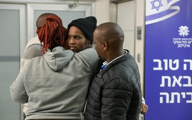 Avera Mengistu (center) is embraced by family members at Ichilov Hospital in Tel Aviv after being released from Hamas captivity in Gaza, February 22, 2025. (Maayan Toaf/GPO)