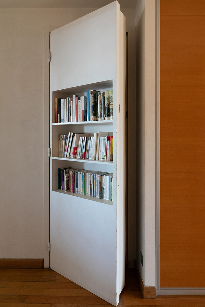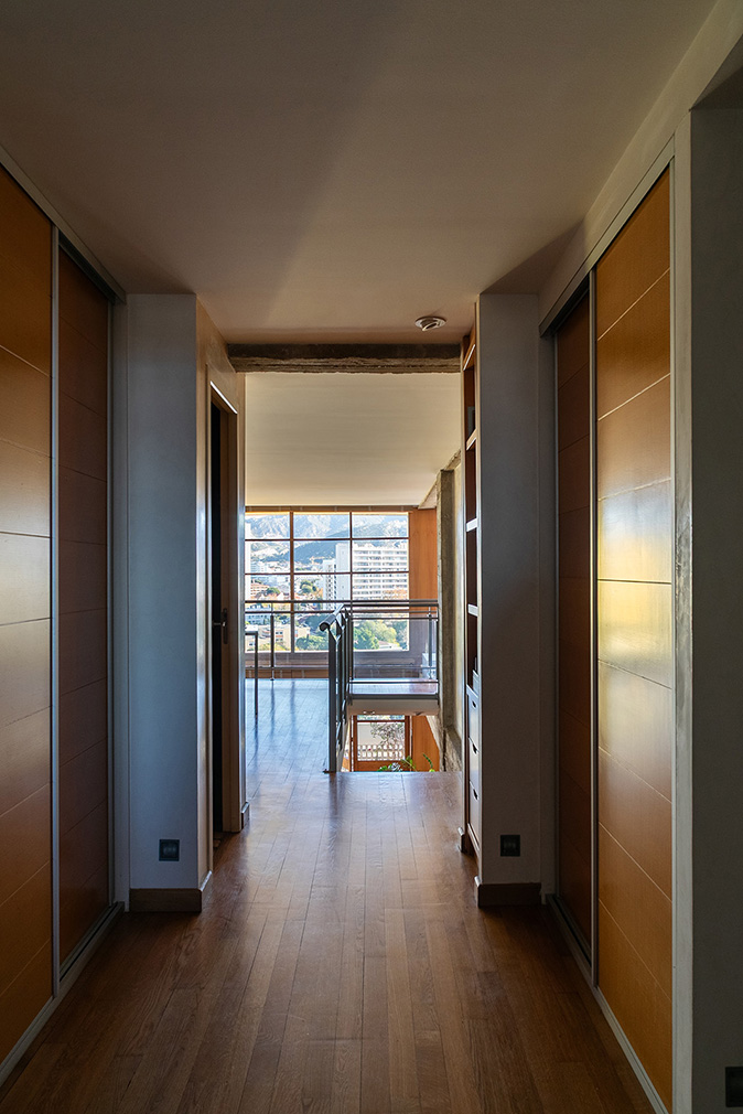 The lower level accommodates the living, dining and library areas, opening onto a doubled loggia that extends the room outward and frames expansive views across Marseille and the surrounding hills. Nearby, the kitchen retains the proportions and intent of the original scheme, designed by Charlotte Perriand and updated in the 1990s with restraint. Upstairs, a bridge-like walkway leads to the private spaces, including a primary suite, two further bedrooms and a study, all organised around light filtered through the double-height glazing. Flexible partitions allow rooms to be opened or closed as needed, maintaining the apartment’s adaptability.