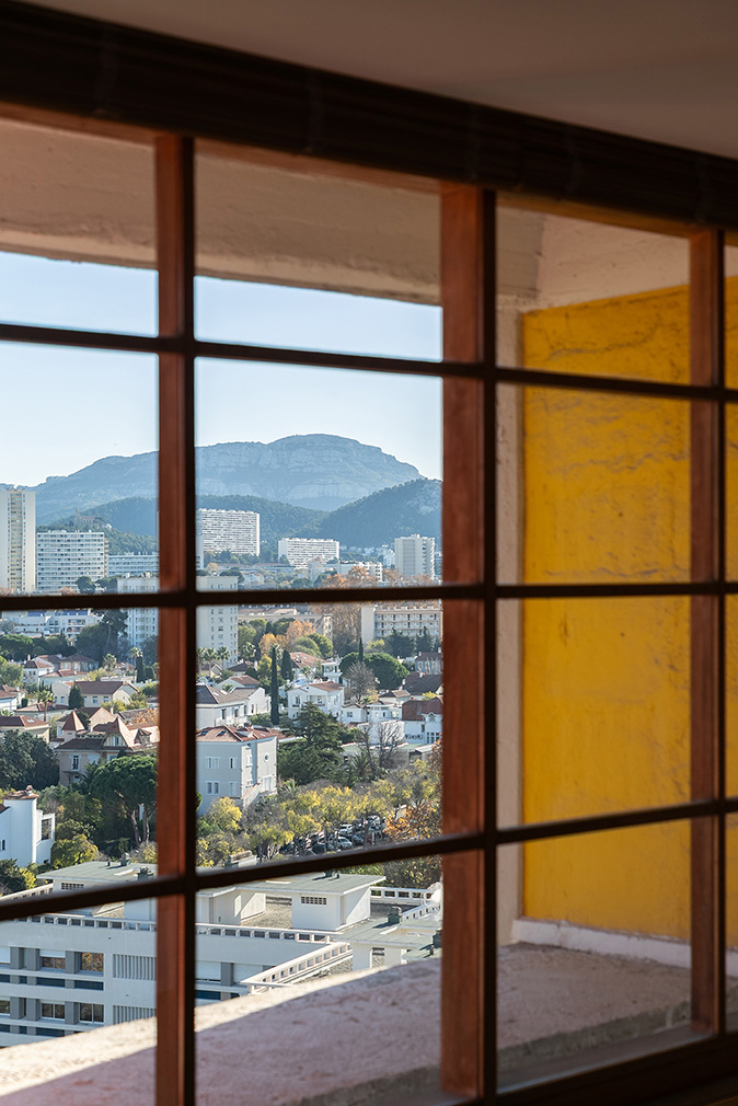 Light is the organising principle of this double Type E duplex, formed in 1966 from the union of two adjacent apartments inside Le Corbusier’s Unité d’Habitation. Set high within the concrete frame, the 200sqm interior is shaped by volume and proportion. A double-height living space draws daylight deep into the plan, where timber floors, exposed béton brut and the rhythm of the original structure establish a calm, measured atmosphere that has changed little since the building’s completion in 1952.