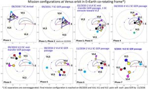 Figure 3: Main mission configurations during different mission phases at Venus orbit in the Earth corotating frame (projected on the ecliptic plane). The banana-shaped region illustrates the magnetic mapping of the Parker-spiral IMF from the Sun to the Earth through Mercury and Venus orbits for fast (red), intermediate (black), and slow (blue) SW speeds. The figure is taken from Nykyri et. al., 2023.