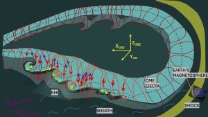 The “Mother’s Day” space storm (also called the Gannon storm), which was the largest since the Halloween storm in 2003, was amplified by the giant 60-250 RE KH waves at the boundaries (see Figure 1) of the coronal mass ejections (CME) that had southward field in the ejecta and hurled out to interplanetary space on May 8, 2024. These waves were detected at L1 satellites and by NASA’s ARTEMIS spacecraft at lunar orbit in the solar wind and by NASA’s four Magnetosphere MultiScale (MMS) spacecraft. As the draped field around the southward ejecta field was mostly northward, the KH waves led to a strong and periodic ~ 45 min – 60 minute +- variability of the IMF Bz component and visible vortex (at least 54 Re in size), most clear in the IMF By-component (Nykyri, 2024).