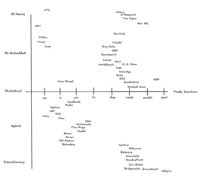 But the old equilibrium is fading. The best-known “AI-first” shops — G-Research, Quadrature, XTX, and HRT — now pitch themselves as machine learning research houses that happen to plug into markets.