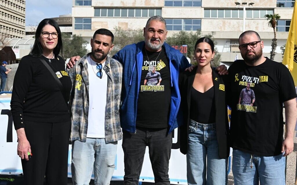 From left: Talik Gvili, Segev Kalfon, Itzik Gvili, Shira Gvili and Eitan Horn, at Hostages Square in Tel Aviv on January 23, 2026. (Jessica Steinberg/Times of Israel)