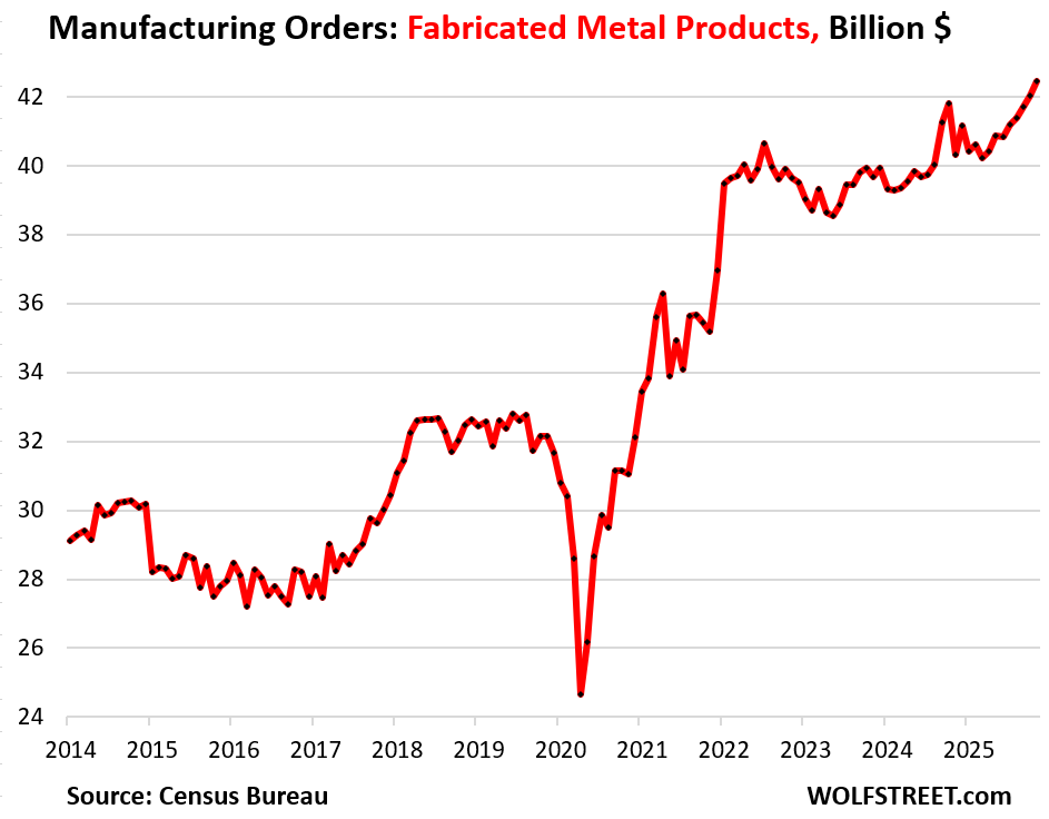 Orders for fabricated metal products rose by 1.0% in November from October, by 3.9% over the past five months, by 5.5% since March, and by 5.3% year-over-year, to a record $42.4 billion.