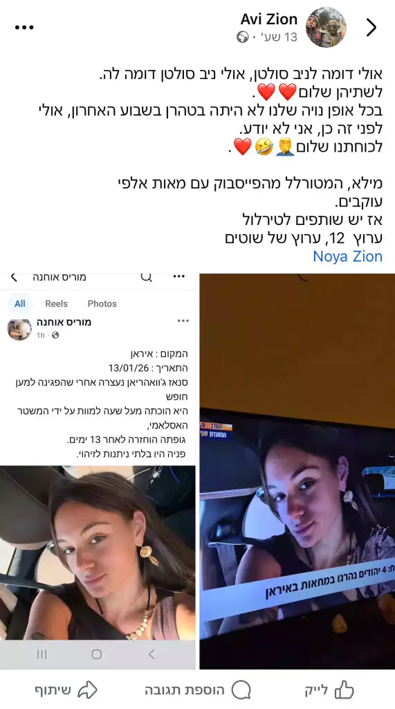 The protests in Iran have claimed, according to various estimates, the lives of tens of thousands of people. Information coming from the country is scarce, but nothing prepared Noya Zion, a young Israeli woman, to discover that she too had “been killed” in the riots.