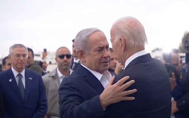 Prime Minister Benjamin Netanyahu (left) and US President Joe Biden embrace at Ben Gurion Airport on October 18, 2023. (Screen capture)