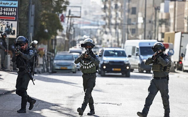 Members of Israeli security forces patrol along a street during a military raid in the neighborhood of Kafr Aqab near Ramallah, West Bank, on January 26, 2026. (Zain JAAFAR / AFP)