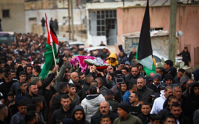 Palestinians attend the funeral of 20-year-old Muhammad Rajih Nasrallah, who was killed after being shot by Israeli security forces, in Hebron, West Bank, January 28, 2026. )Wisam Hashlamoun/Flash90)