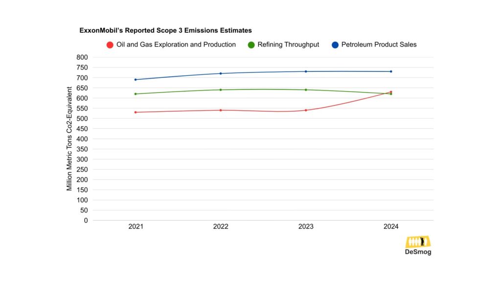 Note: ExxonMobil currently “chooses not to report on the full range of Scope 3 emissions estimates called for under the GHG Protocol,” the company noted in its October legal complaint challenging California’s mandatory climate emissions reporting laws. That means these numbers do not reflect the company’s full Scope 3 emissions, and cannot be compared to estimates prepared by companies that fully follow the GHG Protocol’s standards. They are provided here only to illustrate how ExxonMobil’s own reported figures have changed over time. Image Credit: DeSmog. Data Source: ExxonMobil’s annual climate and sustainability reports.