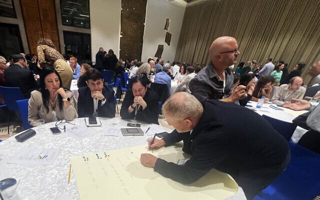 Participants from central and local government and civil society discuss priorities for action in 2026 at a meeting of the Israeli Climate Forum at the President’s Residence, November 30, 2025. (Sue Surkes/Times of Israel)