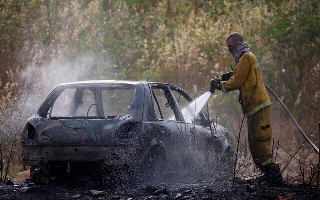 Firefighters put out a fire in vehicles parked near a forest in the Malha area of Jerusalem, during a heat wave across Israel, on July 17, 2019. (Yonatan Sindel/Flash90)