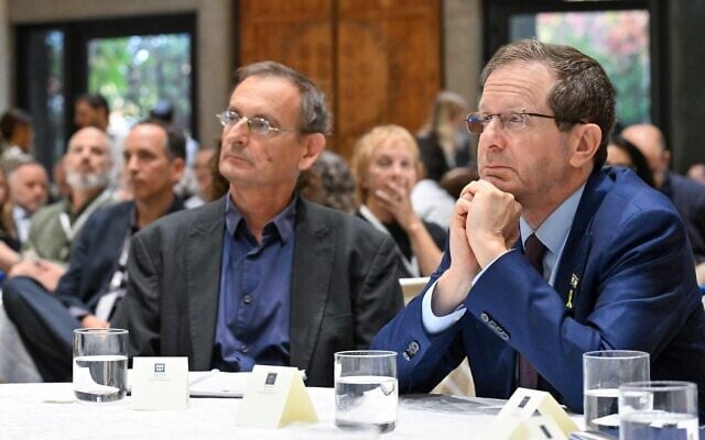 President Isaac Herzog (right) and Israeli Climate Forum chairman Dov Khenin listen to a speaker during the forum’s annual conference at the President’s Residence, November 30, 2026. (Kobi Gideon/Government Press Office)