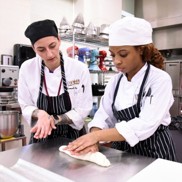 A NOCCA Foundation culinary student works alongside an instructor in a professional kitchen classroom, highlighting pathways from creative education to career opportunity.
