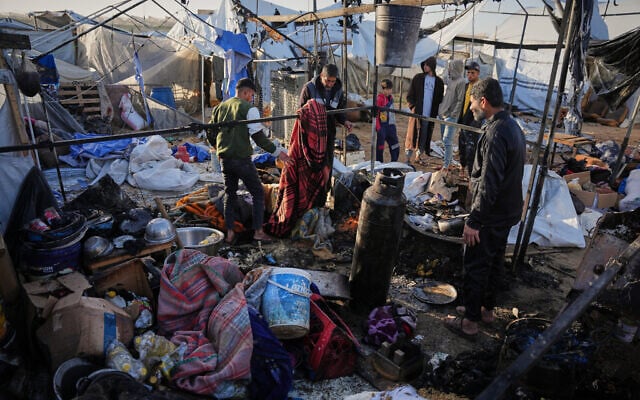 Palestinians inspect damage to a tent hit by an Israeli strike in Khan Younis, in the southern Gaza Strip, January 31, 2026. (AP Photo/Abdel Kareem Hana)