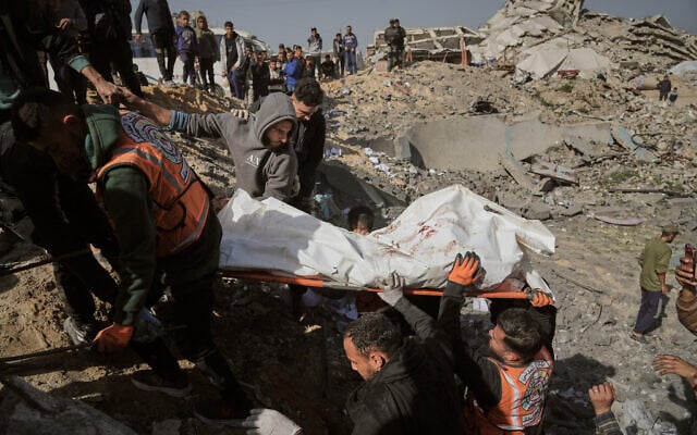 Palestinians carry a body from the rubble of a police station after it was targeted by an Israeli army strike in Gaza City, January 31, 2026. (AP Photo/Jehad Alshrafi)