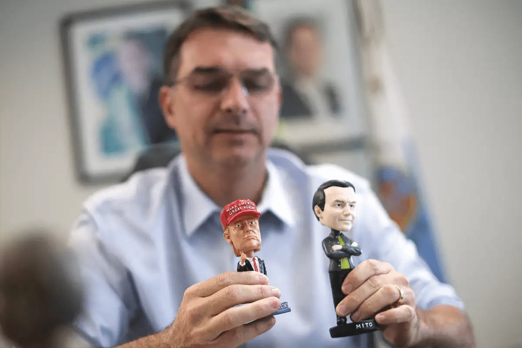 Flávio Bolsonaro holds figurines of Jair Bolsonaro and Donald Trump (Photo: Reuters)