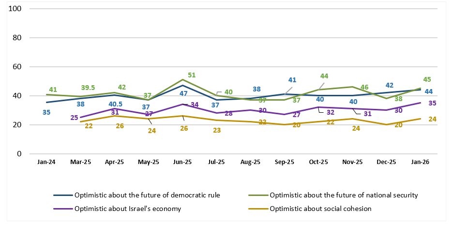 This month saw a rise in optimism about the future for all four topics—democratic rule, national security, the economy, and social cohesion. The largest increase (7 percentage points) was in optimism about the future of national security, and the smallest (2 points), about the future of democratic rule. A review of findings over the past year shows (unsurprisingly) that optimism about the future of national security rose and fell more than optimism in the other three categories. As for the future of Israel’s economy, the share of optimists this month is the largest since we began measuring this topic.