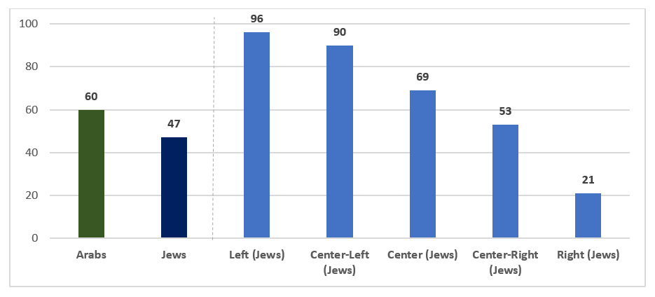 Analyzing the Jewish sample by three political camps reveals that those on the Left and in the Center agree with Barak to a very large degree (92.5% and 69%, respectively), while on the Right, only a minority agree (31%). However, when dividing the Jewish sample into five political camps, we find that even on the Center-Right, the majority agree with Barak, and only among those fully on the Right do the majority (74%) disagree with him. Here, too, the line of separation runs between those fully on the Right and the rest of the Jewish public.