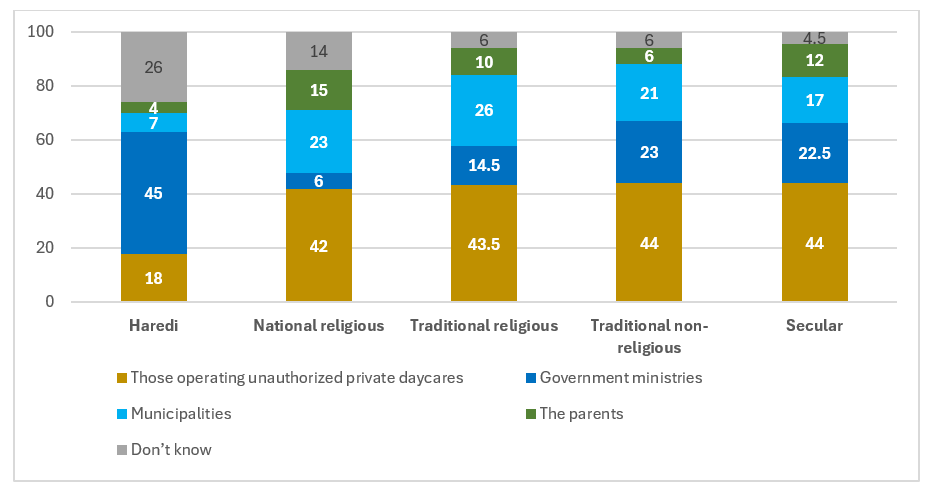 While over 40% of secular, traditional, and national religious Jews attributed the main responsibility to the operators of the daycares, followed by government ministries or municipalities, among Haredim the picture is completely different: the largest share (45%) think that government ministries are mainly responsible. Only a minority of Haredim (18%) blame the operators of daycares. Also striking is the large proportion of Haredim who selected the “don’t know” response, and the small proportion who blame the parents.