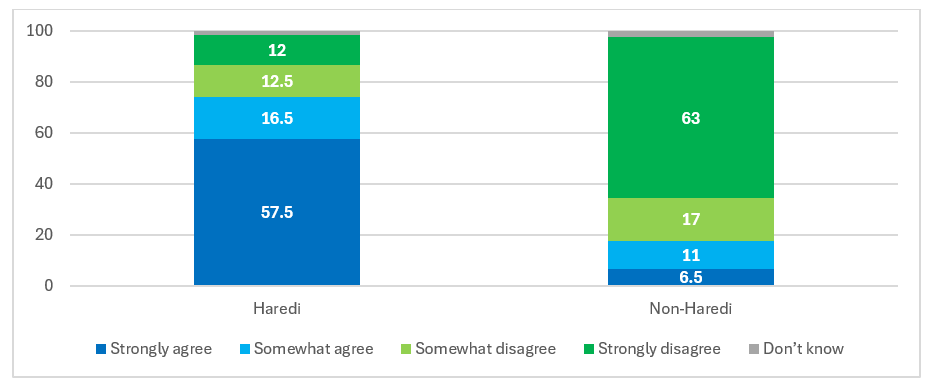 In this context, we also examined the degree of public agreement with the claim made by several Haredi Knesset members and officials that the attorney general is to blame for the deaths of the infants, due to her decision to suspend daycare subsidies for families of kollel students, thus forcing them to place their infants in unauthorized private frameworks that are cheaper. A large majority (70%) of the total sample disagree with this accusation.