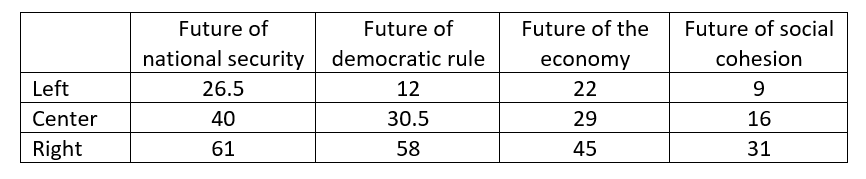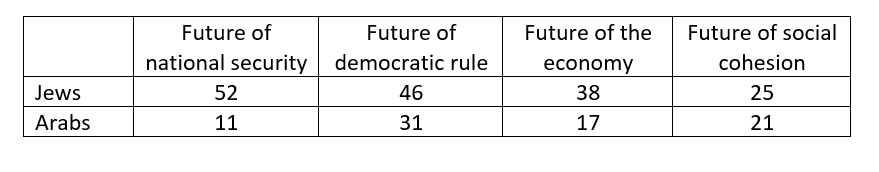 A breakdown of findings by political orientation (Jews) reveals once again that the Left is the least optimistic camp, and the Right is the most optimistic. In fact, on the Left, there is no majority of optimists in any of the four areas, while on the Right, we found a clear majority of optimists regarding the future of national security and the future of democratic rule.