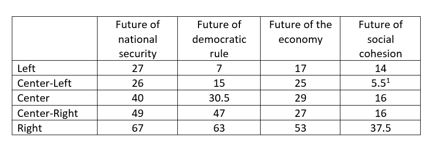 Since this is an election year, in which accuracy is particularly important, this time we refined our analysis and made a differentiation in the two main political camps between those who position themselves toward the extremes and those who position themselves closer to the Center. We found that on both the Left and the Center-Left, as well as in the Center, there are still only a minority of optimists, and even on the Center-Right the share of optimists is less than half (only with regard to national security does this share approach half). However, among those who define themselves as fully on the Right (44% of the Jewish sample), the majority are optimistic, except with regard to social cohesion, though even here, the share of optimists was at least double that found in the other four political categories. In other words, in terms of optimism about the future, the dividing line is between those who define themselves as fully on the Right and the rest of the public, rather than between the Right as a whole and the Left, and perhaps the Center.