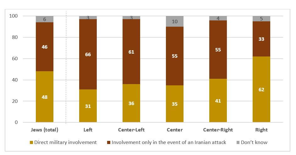 However, even in this case, when we divide the Jewish sample into five categories of political orientation, we find that only among those fully on the Right is there a majority who support direct Israeli participation in an attack on Iran, while in all other categories, including the Center-Right, the majority support participation only in the event of an Iranian attack on Israel.
