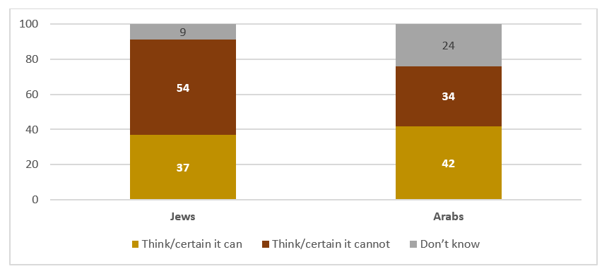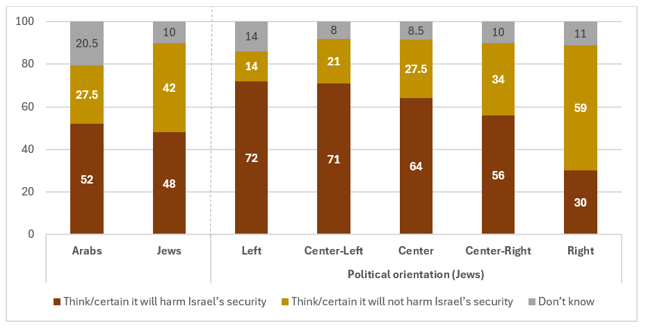 Among both Jews and Arabs, a greater proportion think that this step will harm Israel’s security than hold the opposite view (Jews: 48% vs. 42%, respectively; Arabs: 52% vs. 27.5%, respectively).