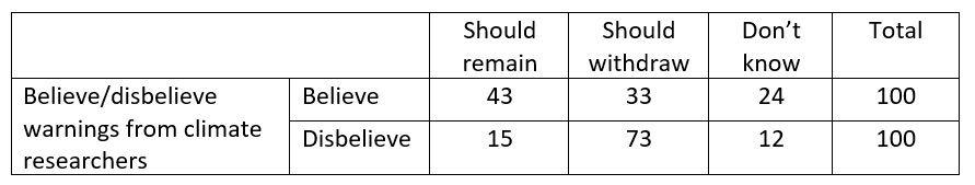 Cross-tabulating the responses to the two questions shows that among those who do not believe the warnings of scientists, a large majority support withdrawing from the UN Convention (73%). Among those who do believe the scientists’ warnings, the largest share (43%) support remaining in the Convention, a third support withdrawing, and around a quarter don’t know. In other words, believing the climate scientists’ claims influences attitudes toward withdrawal from the UN Convention on Climate Change.