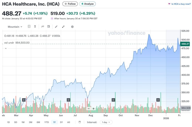 HCA Healthcare’s stock has increased 46 percent over the past year. On Feb. 2, 2025, it stood at $334.30 per share; it closed Friday at $488.27 per share. // Source: Finance.yahoo.com