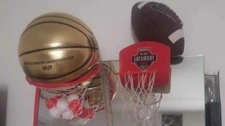 Deni Avdija’s mini hoop with an NBA All-Star logo on it.