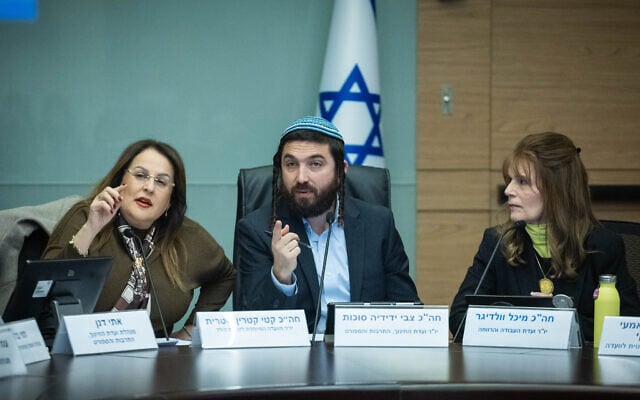 MKs Zvi Sukkot, Michal Woldiger and Keti Shitrit lead a joint meeting of the Knesset Education, Culture and Sports Committee, in Jerusalem, January 26, 2026. (Yonatan Sindel/Flash90)