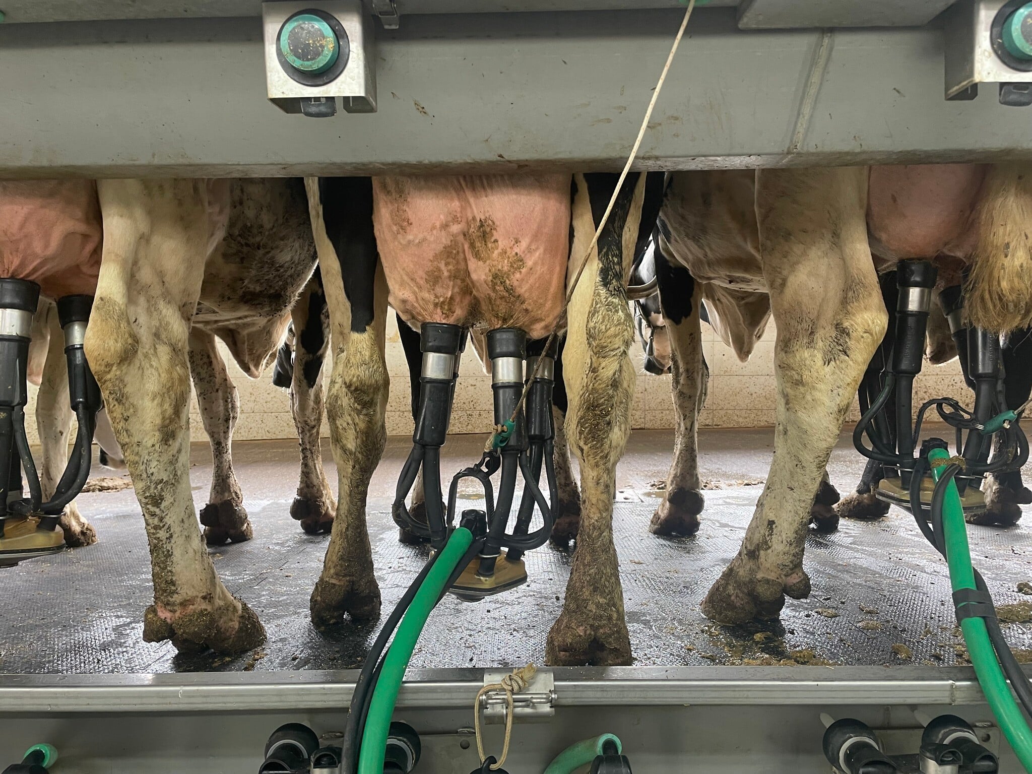 Milking time at Kibbutz Alumim’s dairy, near the Gaza border in southern Israel, January 13, 2026. (Sue Surkes/Times of Israel)