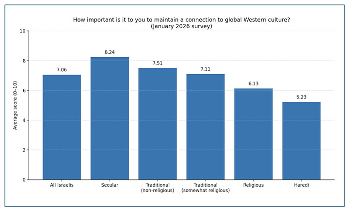 Predictably, the demographic split is sharp. Secular Israelis score the connection significantly higher (8.24) than religious Israelis (6.13); the Center and Left score it higher than the Right. But what, exactly, are respondents scoring? When a secular Israeli hears “the West,” they likely picture democratic institutions, markets, universities, innovation, individual freedom and tolerance. When a religious conservative hears “the West,” they may picture Europeans scolding Israel, hesitations toward Iran, fashionable contempt for religion and bureaucratic moralizing. Two Israelis who share many values might still have a different answer on “the West” because they imagine different “West” brands. One group believes “The West” represents the values they cherish; the other believes it represents a betrayal of those values.