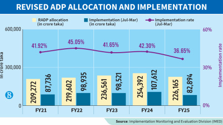 In the 2024-25 fiscal year, implementation of the Annual Development Programme (ADP) stood at 67.85% of the allocation, the lowest rate in the past one and a half decades.