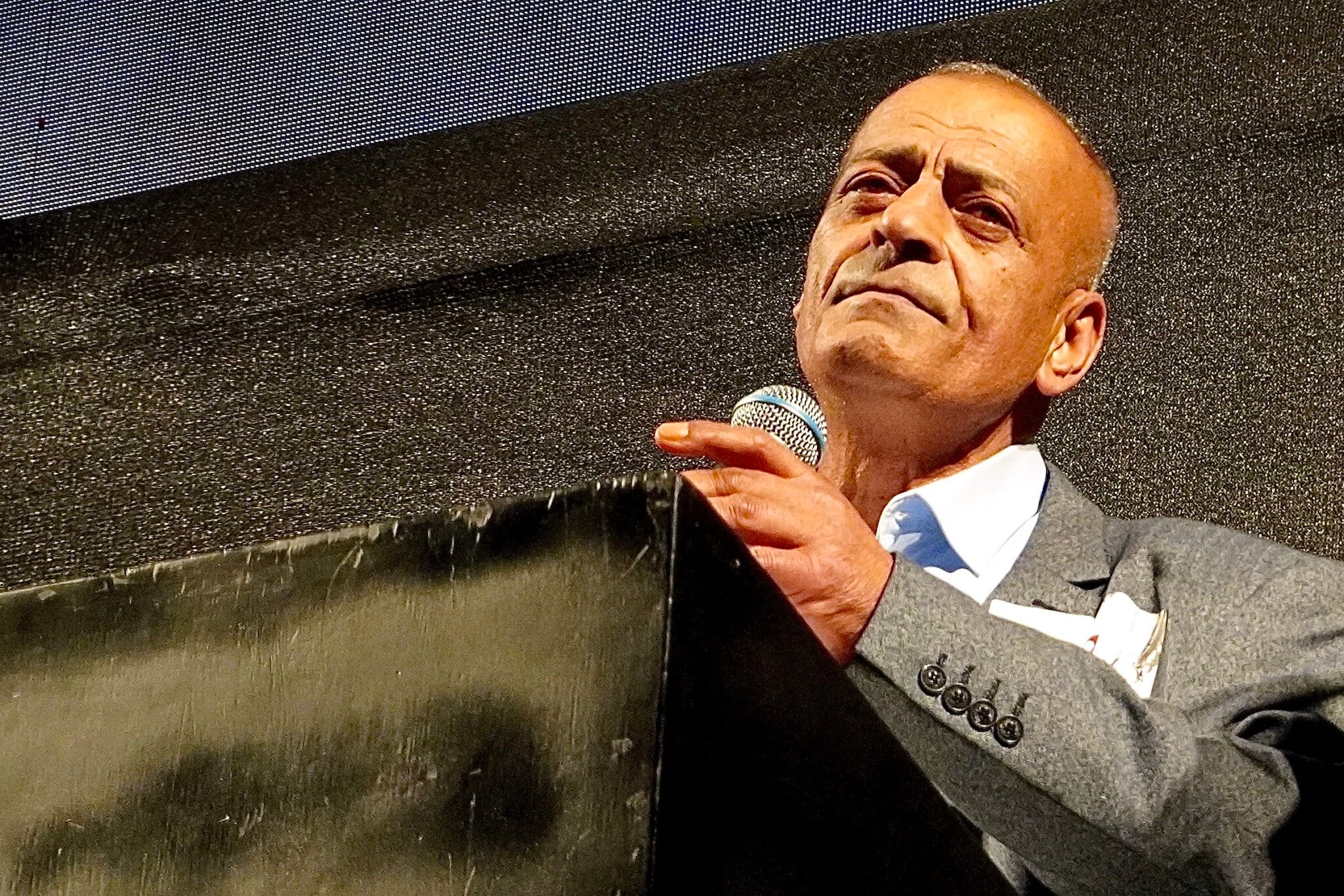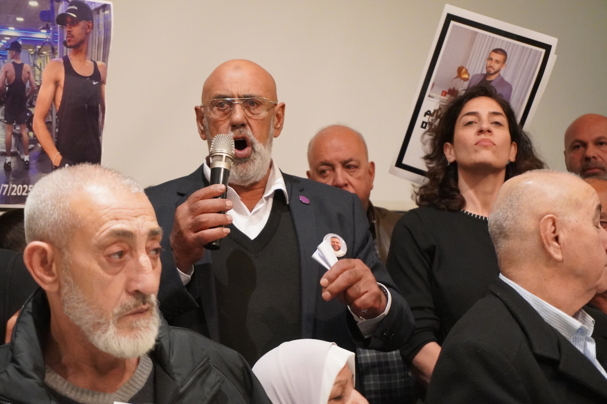 Qasem Awad, the father of Abdallah Awad, a pediatrician who was killed in Kafr Yasif, speaks in Nazareth about his son’s murder on January 29, 2026. (Charlie Summers/Times of Israel)