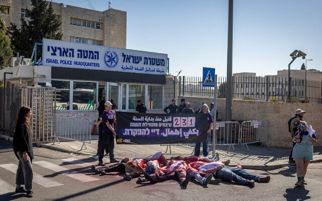 Members of the ‘Standing Together’ movement protest outside Israel’s national police headquarters in Jerusalem against rising violence in Arab communities in Israel, November 23, 2025. (Chaim Goldberg/Flash90)