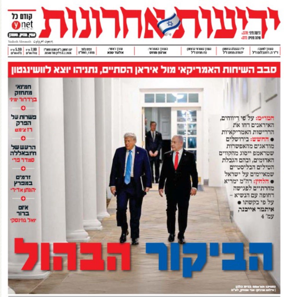 Top Banner (White on Red): “The American round [of talks] against Iran has ended; Netanyahu is leaving for Washington.”