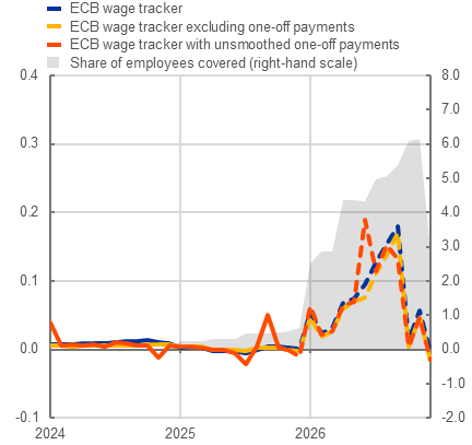 The ECB wage tracker with unsmoothed one-off payments also reflects a more stable and less volatile outlook for negotiated wage growth in 2026 (2.9% in the first half of the year, 2.6% in the second half) compared with previous years. The wage tracker excluding one-off payments stands at 2.7% for both the first and second half of 2026, also suggesting more moderate dynamics in negotiated base wages than in previous years. Employee coverage for 2026 stands at 37.1% for the first half of the year and 29.2% for the second half. See Chart 1 and Table 1 for further details.