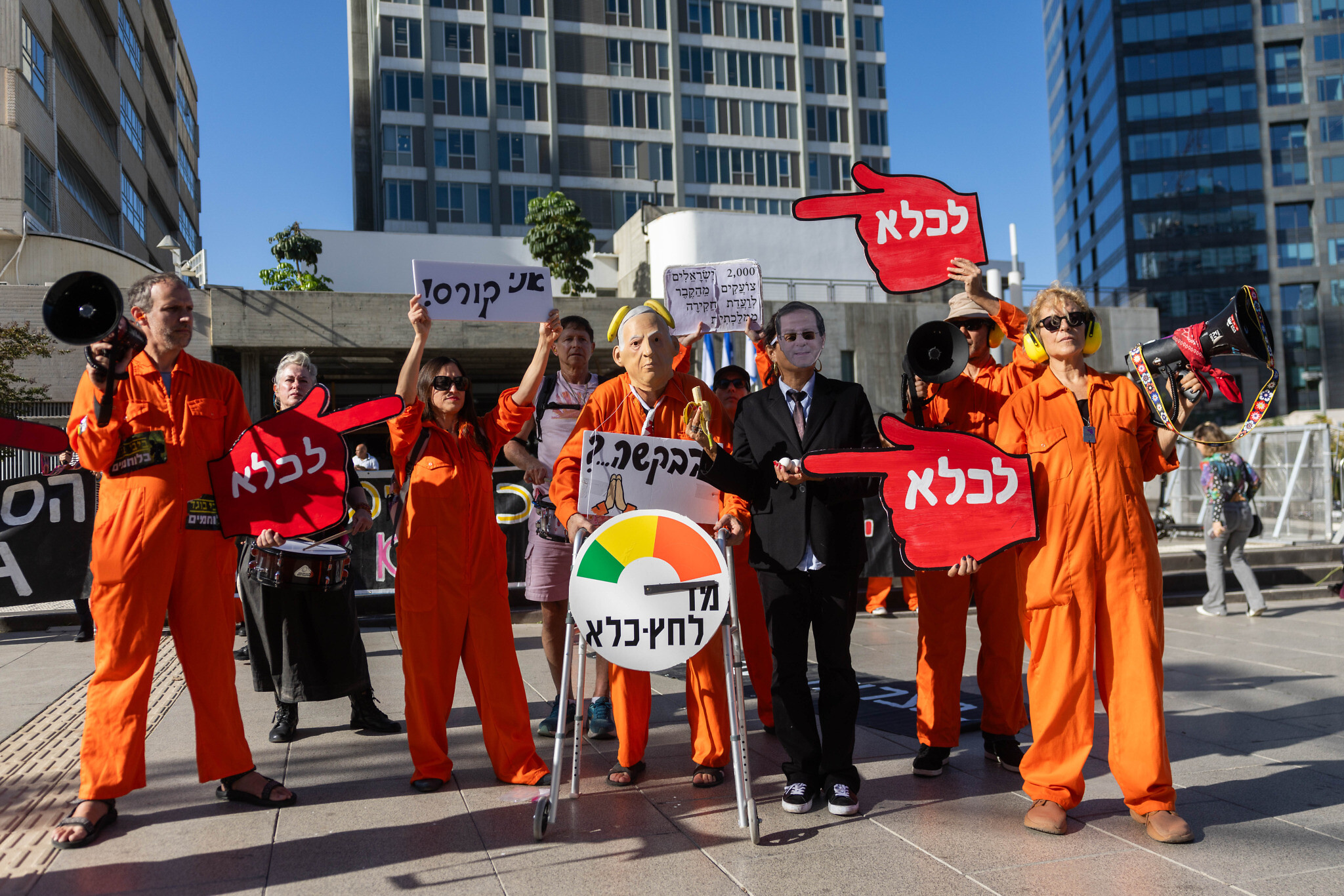 Activists protest outside a court hearing in the trial of Prime Minister Benjamin Netanyahu in Tel Aviv, calling not to grant him a pardon, December 1, 2025. (Chaim Goldberg/Flash90)