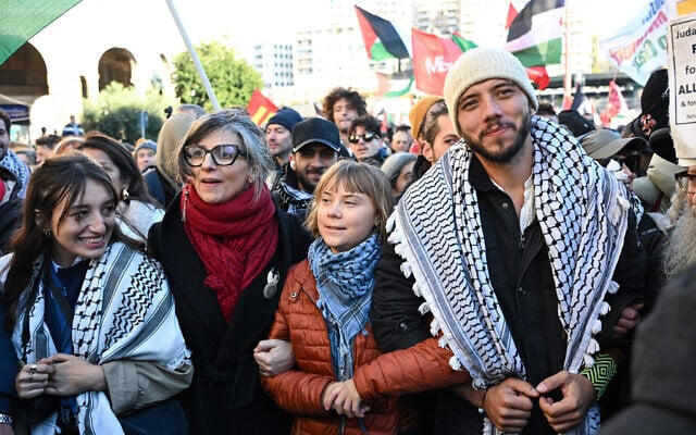 UN Special Rapporteur Francesca Albanese (2ndL), Swedish activist of Global Sumud Flotilla, Greta Thunberg (C) and Brazilian activist Thiago Avila (R) march during an anti-Israel, pro-Palestinian demonstration as part of the nationwide general strike, in Genoa on November 28, 2025 (Piero CRUCIATTI / AFP)
