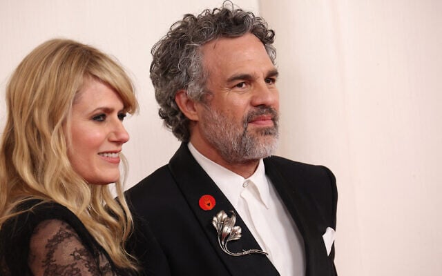 Sunrise Coigney (L) and Mark Ruffalo (R) attend the 96th Annual Academy Awards on March 10, 2024 in Hollywood, California. Ruffalo is wearing a pin depicting an orange hand holding a heart, which calls for a ceasefire in Gaza. (JC Olivera/Getty Images North America/Getty Images via AFP)