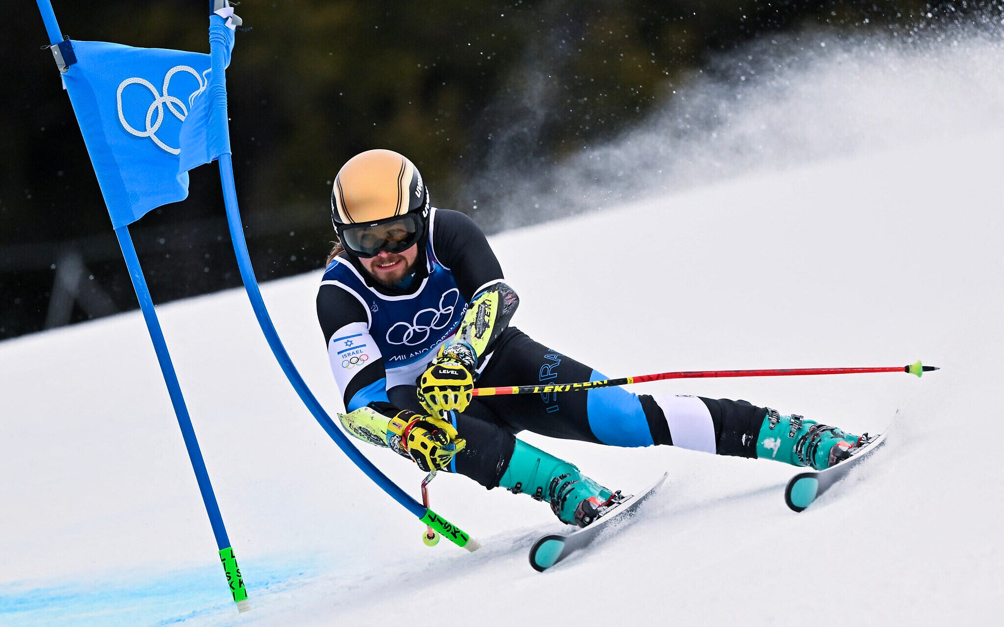 Israel’s Barnabas Szollos passes a gate in the first run of the men’s giant slalom alpine skiing event during the Milano Cortina 2026 Winter Olympic Games at the Stelvio Ski Centre in Bormio (Valtellina) on February 14, 2026 (Fabrice COFFRINI / AFP)