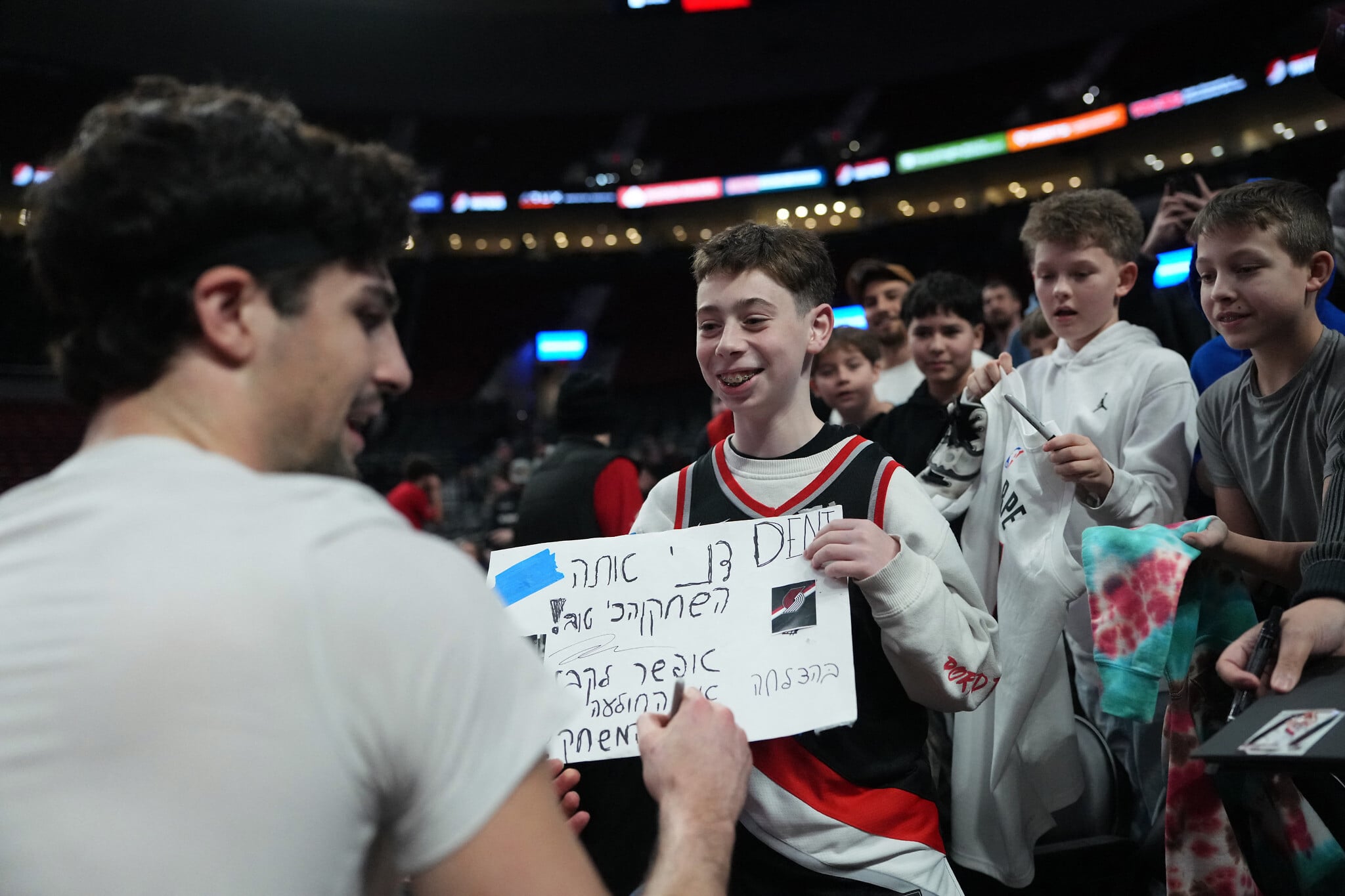 Deni Avdija of the Portland Trail Blazers signs an autograph for a basketball fan before a game against the Cleveland Cavaliers at Moda Center on February 01, 2026 (Soobum Im / Getty Images via AFP)
