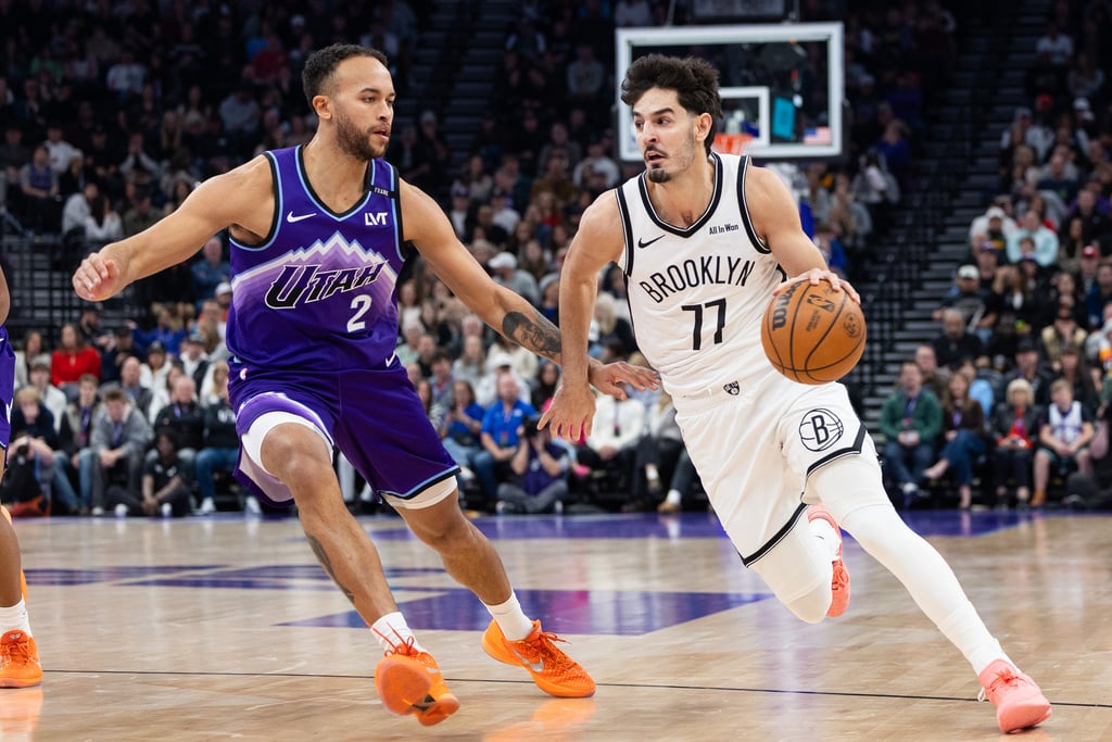 Brooklyn Nets guard Ben Saraf, right, dribbles past Utah Jazz forward Kyle Anderson during the first half of an NBA basketball game, Friday, Jan. 30, 2026, in Salt Lake City. (AP/Anna Fuder)