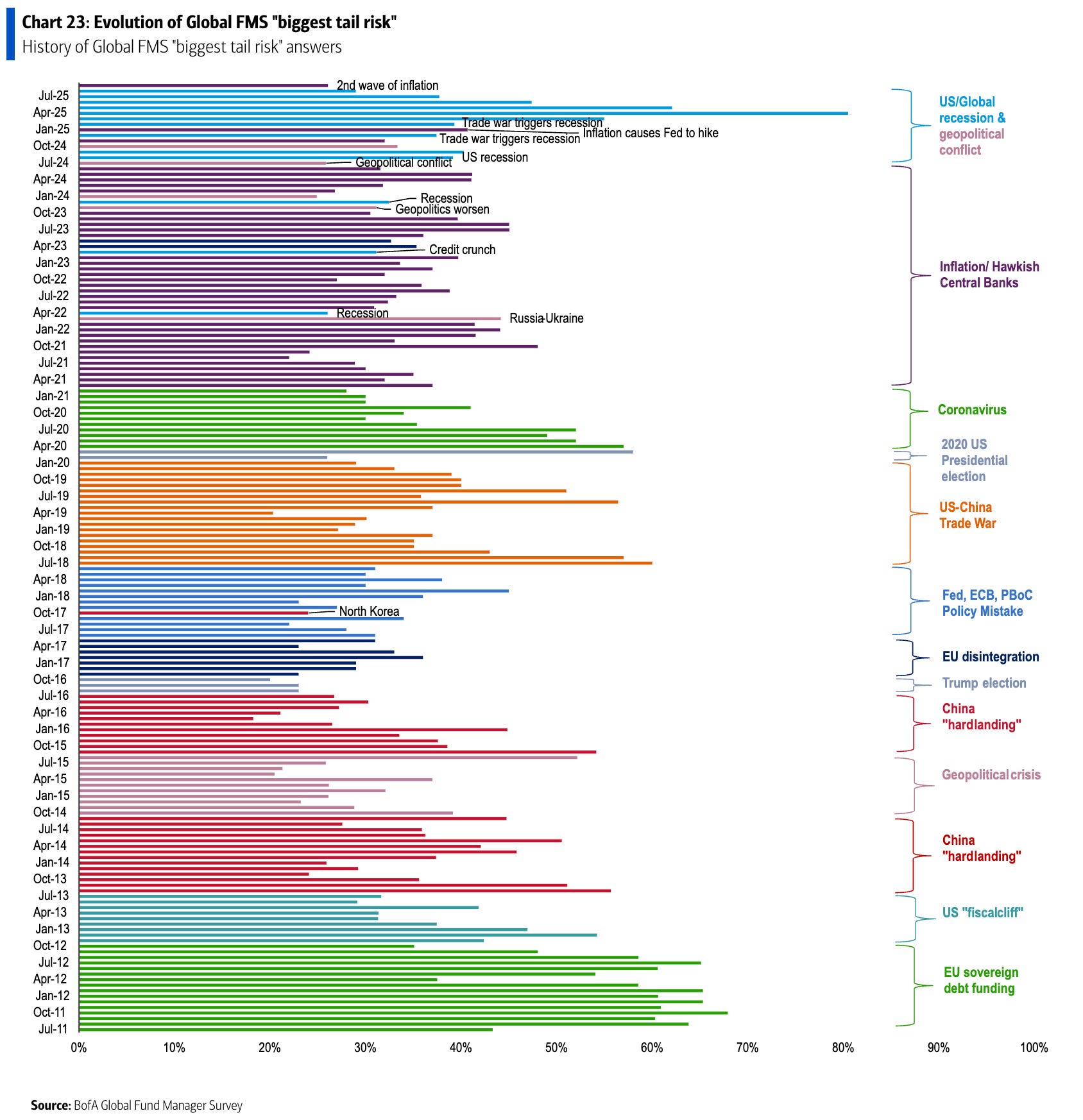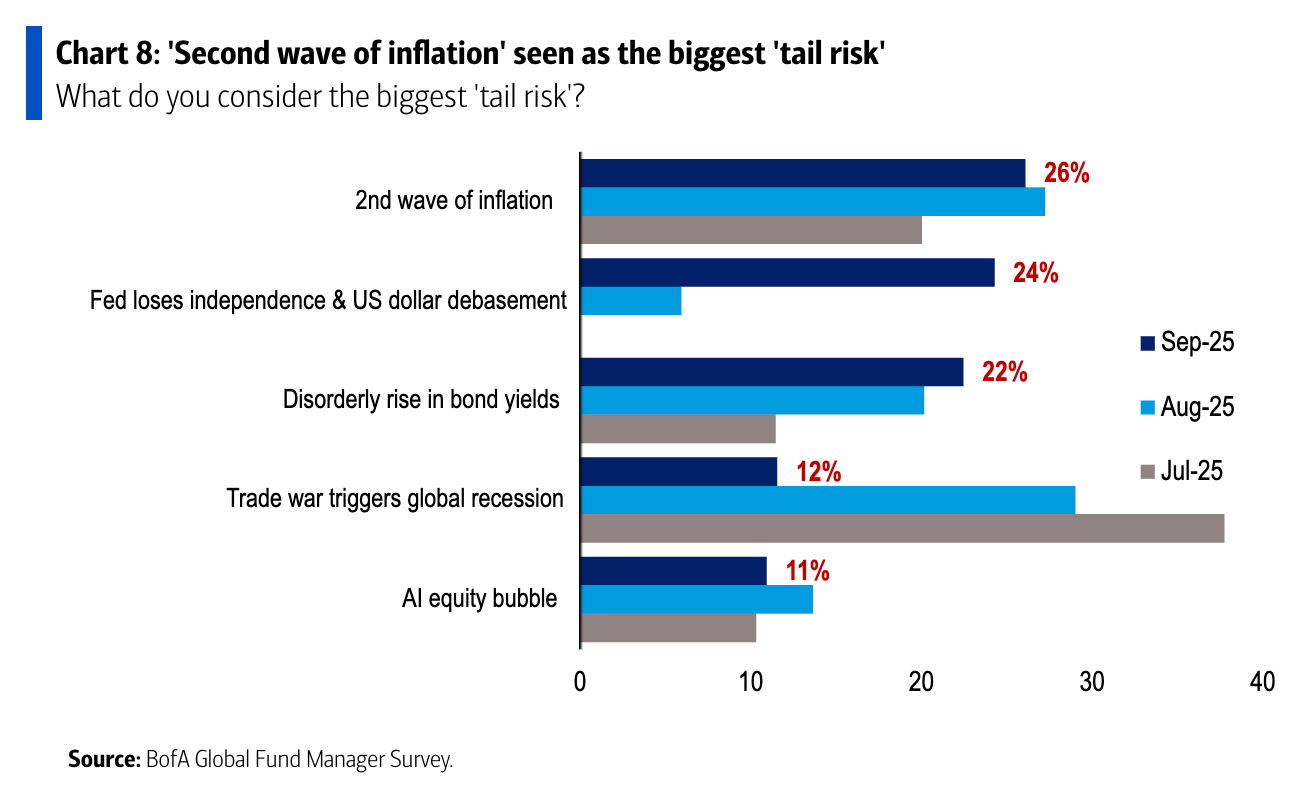 π¬ This is the stuff pros are worried about. From BofAβs September Global Fund Manager Survey: β26% of FMS investors view a 2nd wave of inflation as the biggest tail risk, followed by 24% saying ‘Fed loses independence & US dollar debasement’ is the biggest tail risk. Trade war risk is fading with just 12% of investors saying ‘trade war triggering global recession’ is the biggest tail risk (down from #1 spot at 29% in August).β